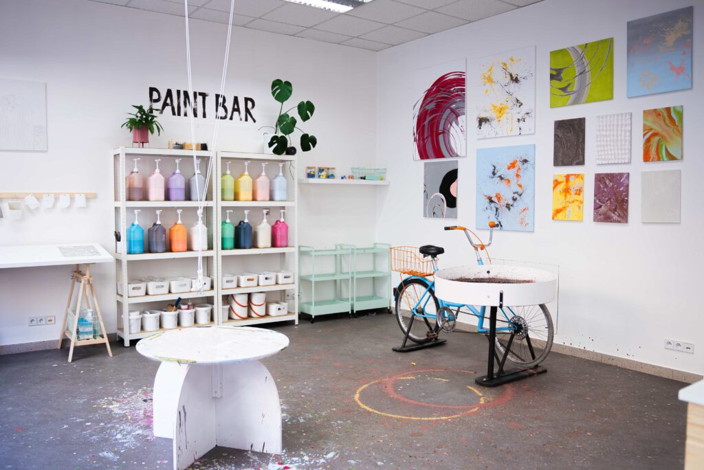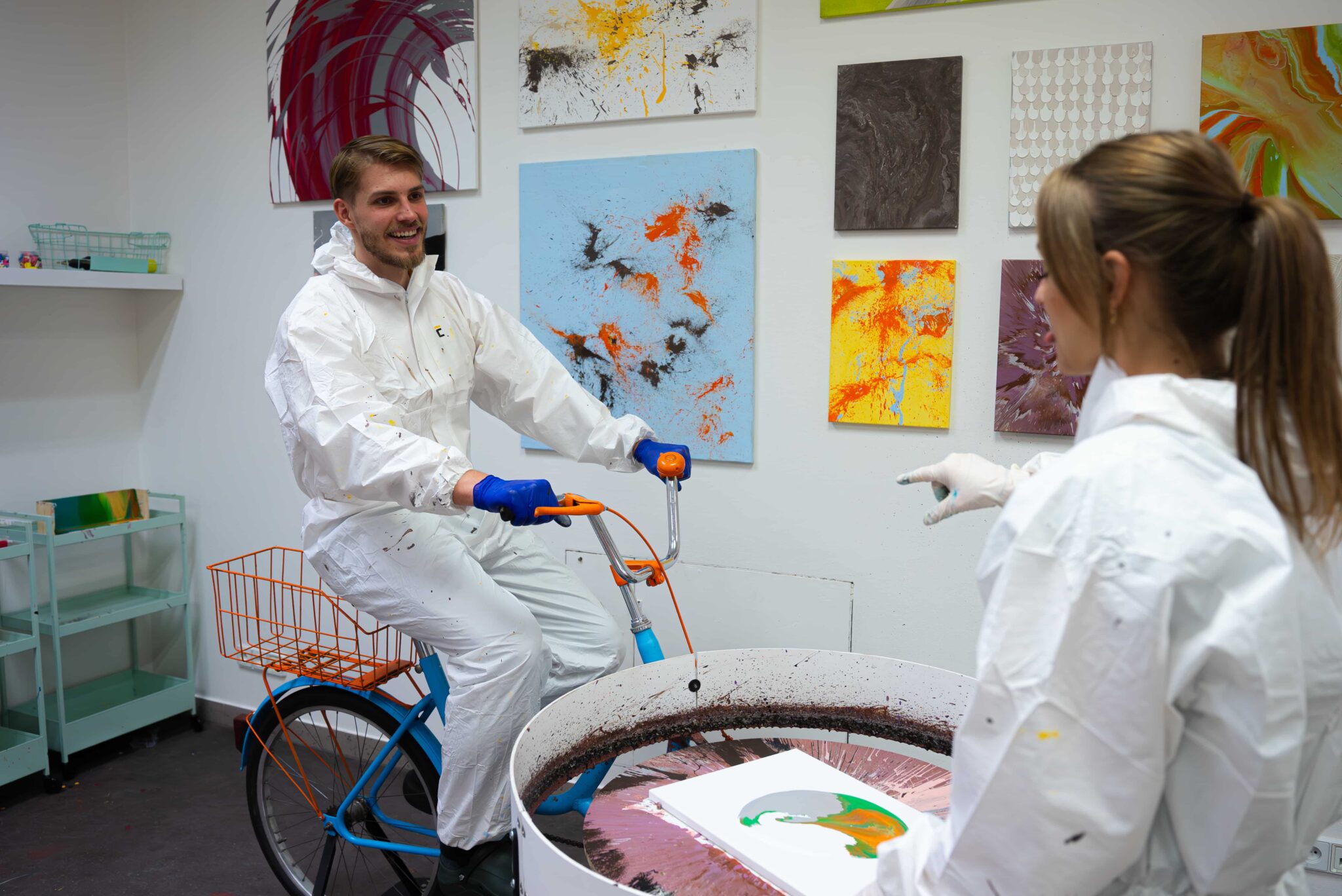 Tohle tvoření bude jízda! Vaše Mistrovské dílo totiž vznikne pomocí jízdního kola. Šlapáním rozpohybujete desku a barvy nanášíte přímo na plátno. Díky odstředivé síle vznikají výjimečné abstraktní obrazy. Ideální pro techniku pouring.