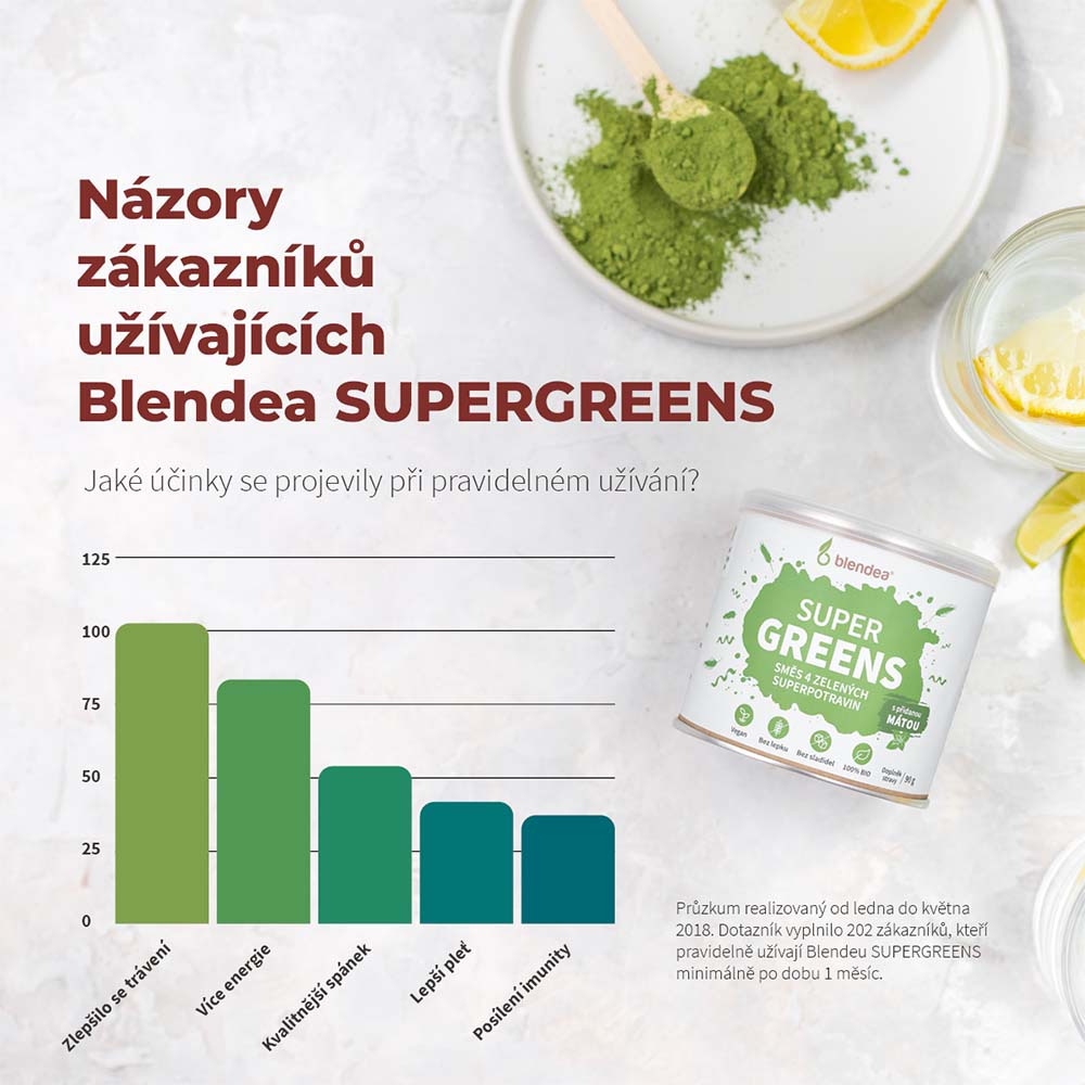 Obsažená spirulina pomáhá ke snížení chuti k jídlu a kontrole hmotnosti. Produkt SUPERGREENS je bez přidaného cukru, obsahuje pouze přirozeně se vyskytující cukry jednotlivých složek.