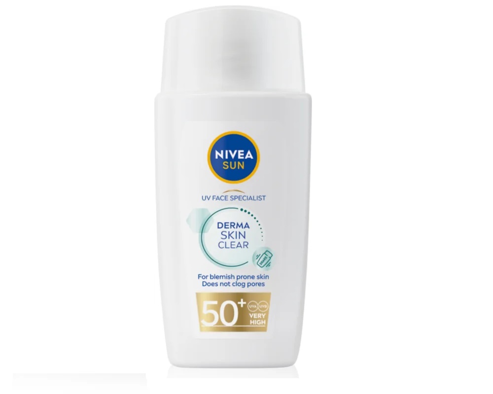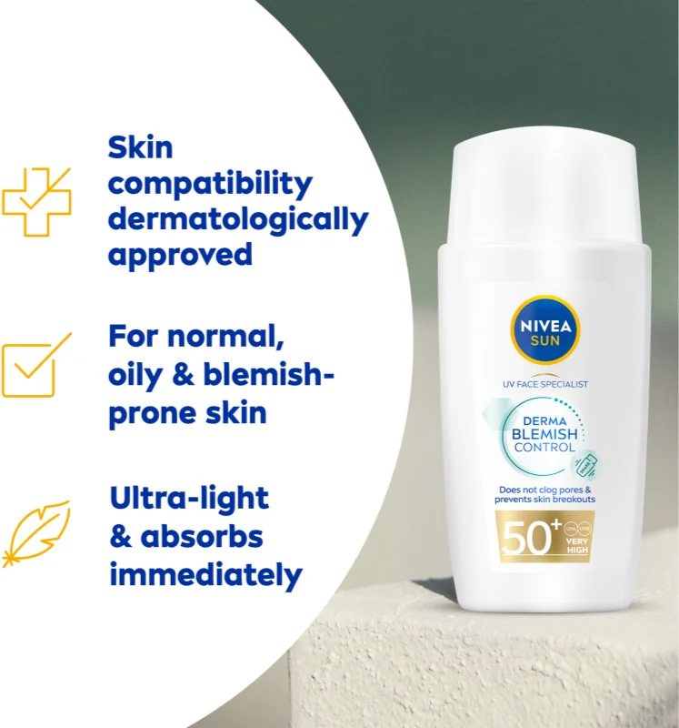 NIVEA SUN pleťový krém Expert Derma Skin Clear OF 50+ s ultralehkou texturou vás ochrání před UVA/UVB zářením bez toho, aniž by zatížil pleť nebo ucpával póry. Díky učinnému anti-blemish komplexu má krém nemastné složení a spolu s niacinamidem pomáhá předcházet vzniku nedokonalostí tím, že absorbuje přebytečný maz z pleti. Vaše pleť se tak nebude lesknout a vydrží krásně matná, a to až 8 hodin. Po lehkém pleťovém krému bude vaše pleť hydratovaná a přirozeně zářivá. Krém můžete použít na všechny typy pleti – normální, mastnou se sklonem k nedokonalostem i citlivou. Nebojte se ho použít také na oblast kolem očí, krém je oftalmologicky testovaný a schválený.