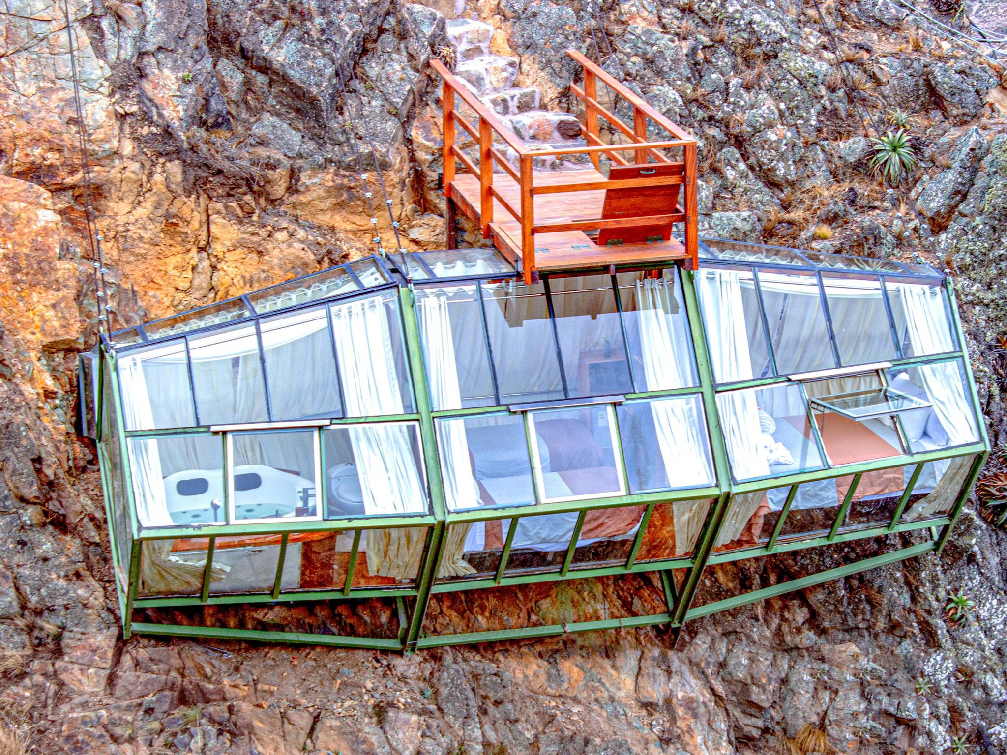 V tomhle hotelu nudné pokoje rozhodně nenajdeš! Hotel je ve výšce asi 3,500 metrů nad mořem a pokoje jsou zavěšené vysoko nad zemí – cítíte se tady jako byste se vznášeli mezi mraky